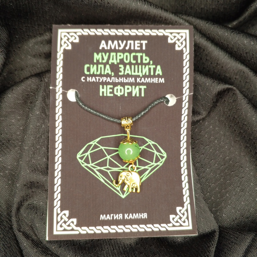25523Амулет здоровья с камнем нефрит. Зеленый нефрит - признанный с древности талисман жизненной силы и благополучия. Слон олицетворяет силу, долголетие, мудрость.