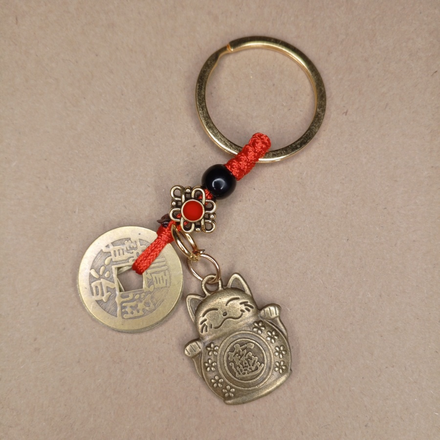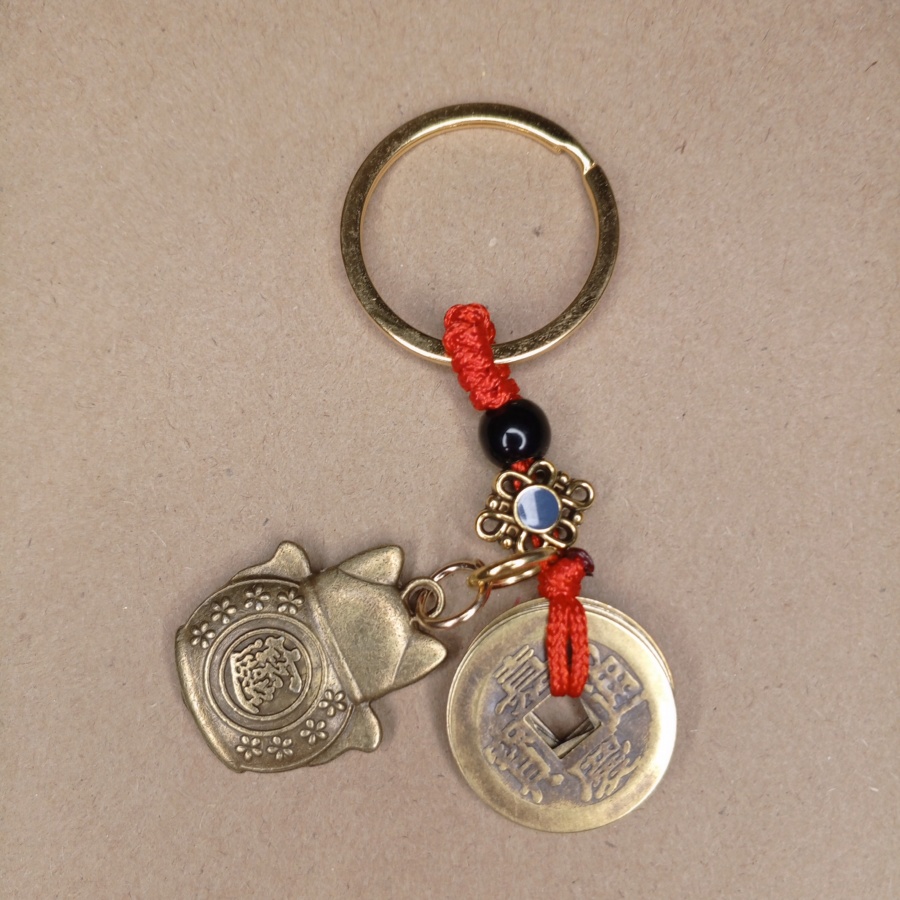 Брелок для ключей с Котом Удачи и связкой из 3 монет, символизирующей богатство.