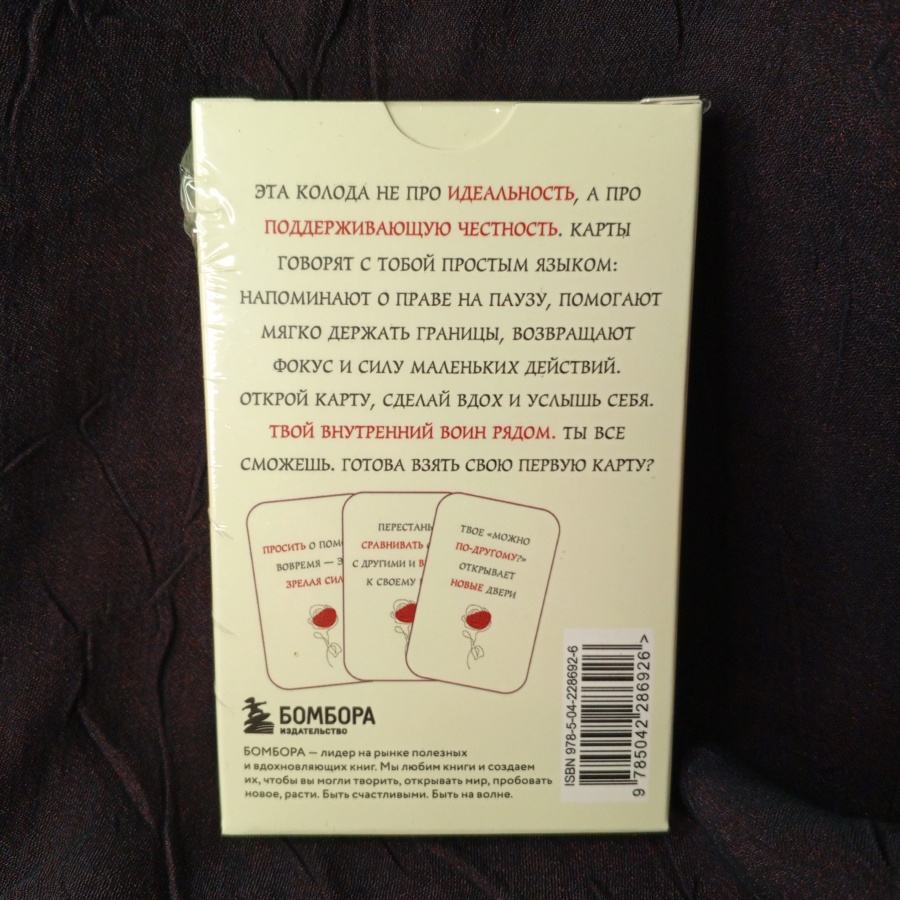 25488Лаконично оформленные карты с простыми понятными посланиями. Подсказки внутреннего воина научат побеждать и добиваться цели мудро. Можно получать желаемое, не жертвуя собой и не выгорая в процессе. Внутренний воин может научиться не только вступать в битвы, но и идти на компромиссы и достигать договоренностей. Карты про силу и умение ее беречь.