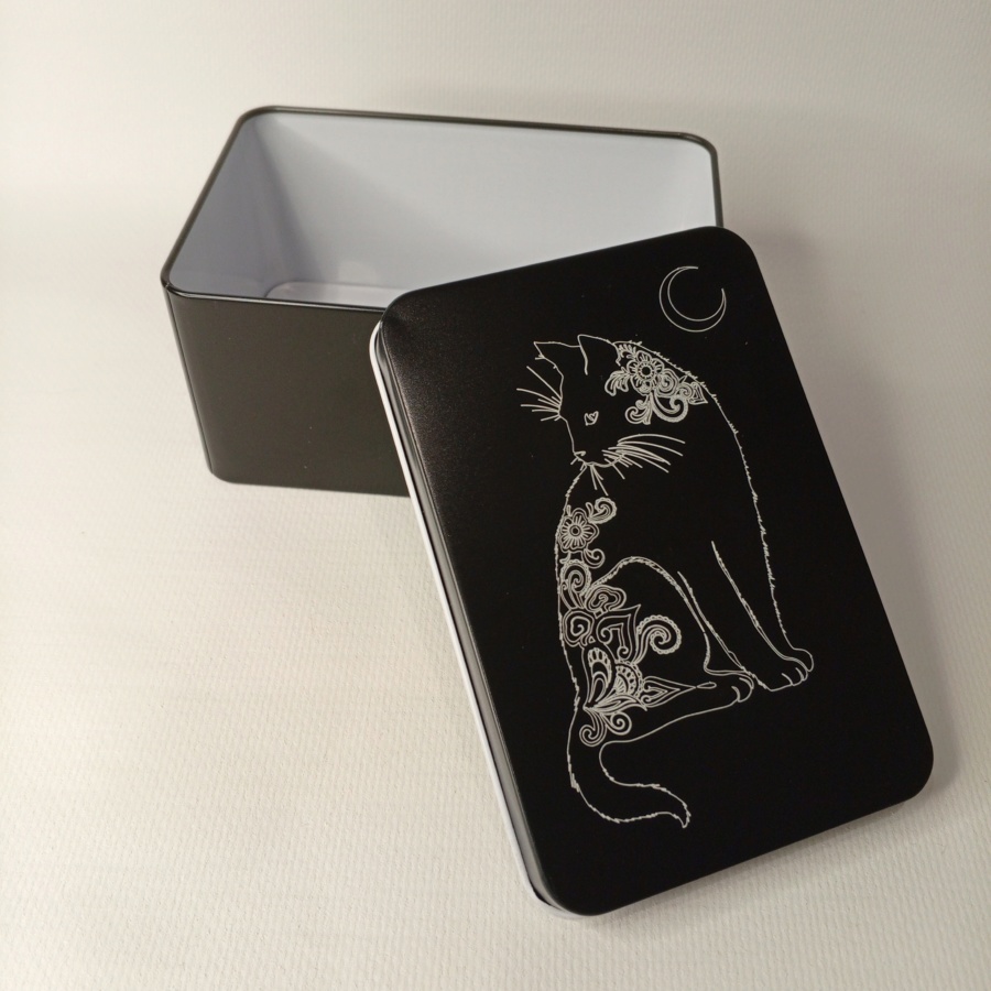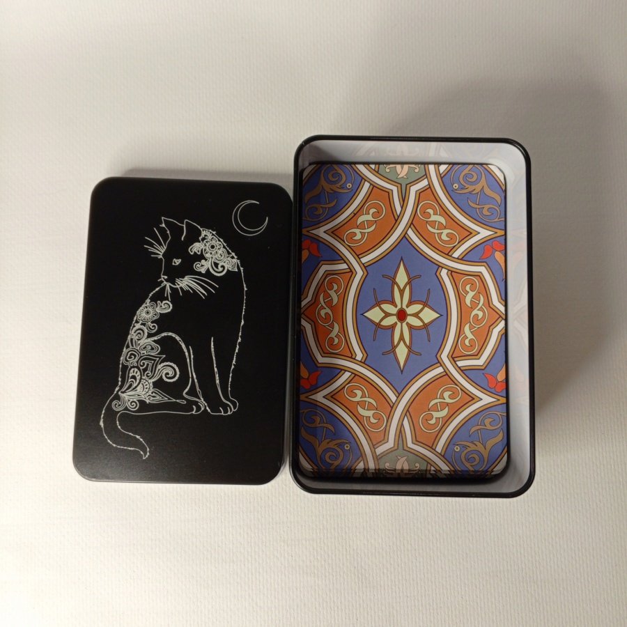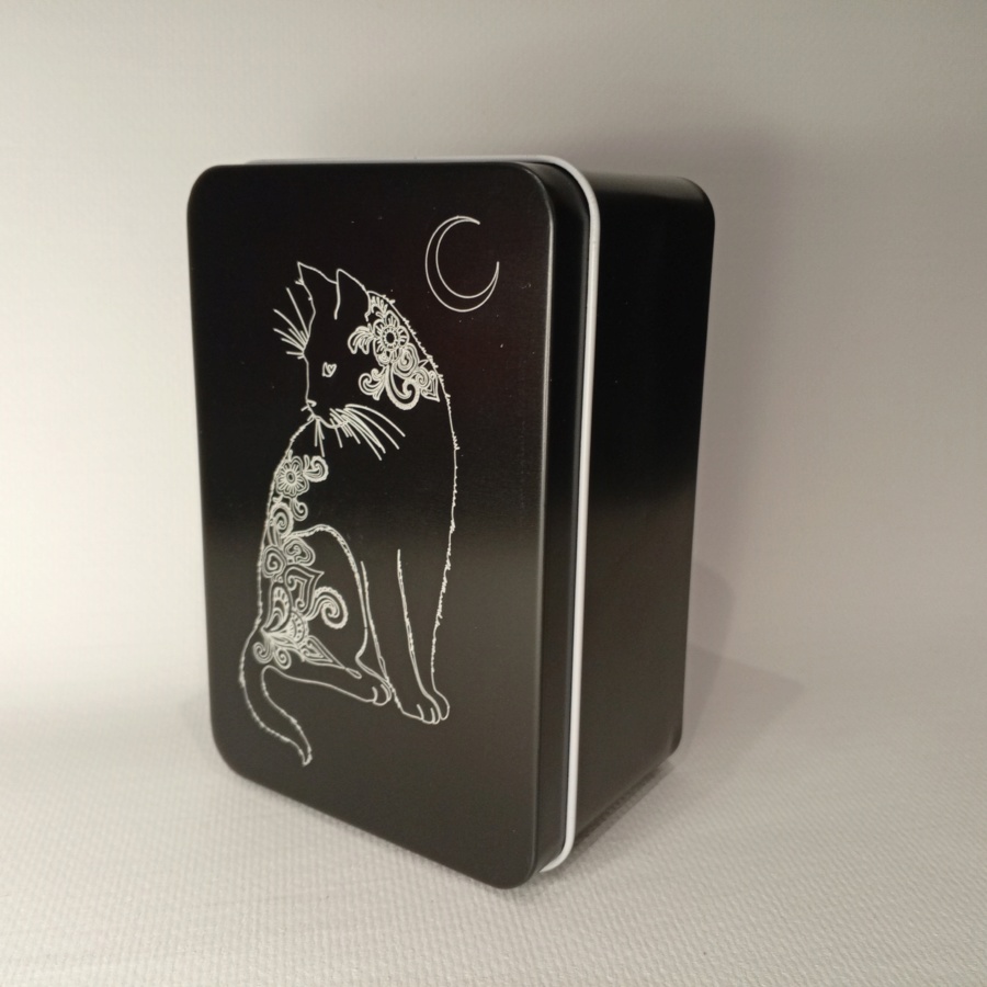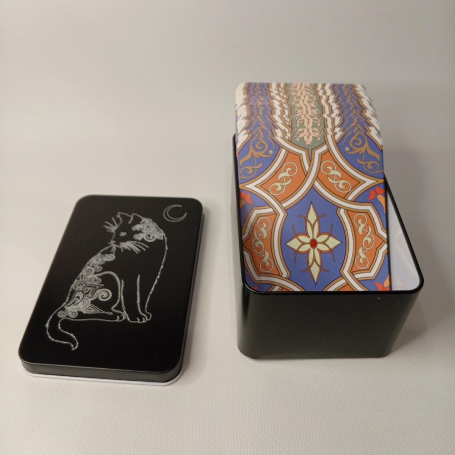 25621Широкая и глубокая металлическая коробка для гадальных карт. Помещается точно по размеру коробки колода форматом 12 х 8 см. (размещение именно такого размера колоды показано на последних фото), при этом остается дополнительное место сверху над картами, и туда можно поместить еще что-либо для гадания, например свернутую небольшую скатерть. Крышка прилегает точно и снимается с небольшим усилием.