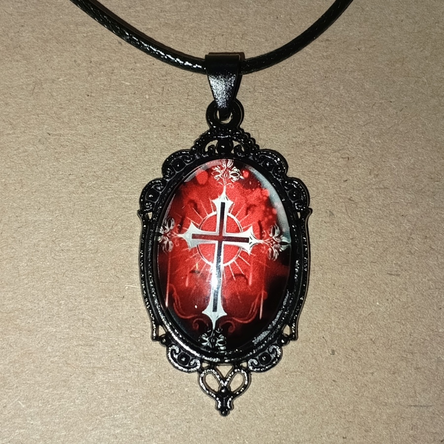 25591Кулон с выпуклым стеклом, под стеклом яркое изображение с крестом, из концов которого выходят узоры, напоминающие геральдические лилии. Это не канонический, а авторский вариант христианского символа. Изображение является красивой стилизацией знаменитого кельтского креста.