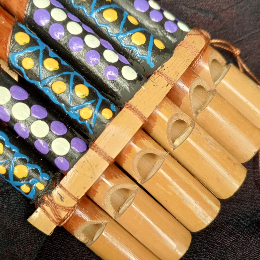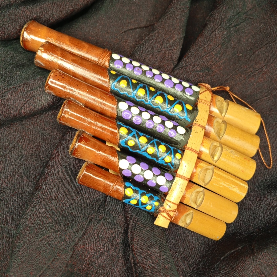 Изготовлена в Индонезии, украшена традиционным точечным узором. В составе 6 трубочек, позволяющих играть простые импровизированные мелодии. Подходит для музыкотерапии, музыкальных игр, для украшения интерьера, как дополнение к этническим костюмам. Звук у флейты Пана негромкий, расслабляющий поэтому игра на ней способствует релаксации и успокоению дыхания.