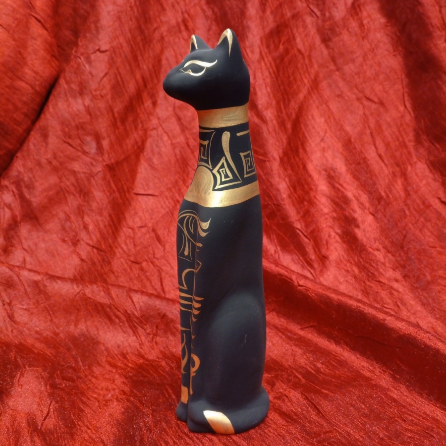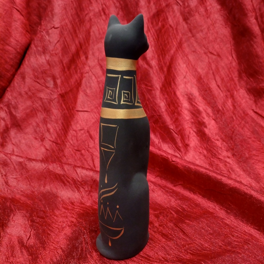 25515Украшение для интерьера, стилизованное под Египет. Керамическая кошка с матовым черным покрытием и роспись золотистой краской. Изображены орнаменты, стилизованное Око Гора, Анкх, и похожие на египетские иероглифы.