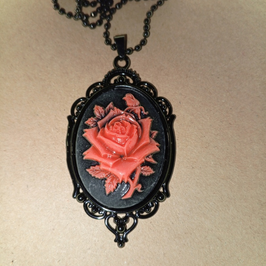 25578Кулон в готическом стиле с выпуклым изображением розы. Металлическая оправа со вставкой из полимерного материала.