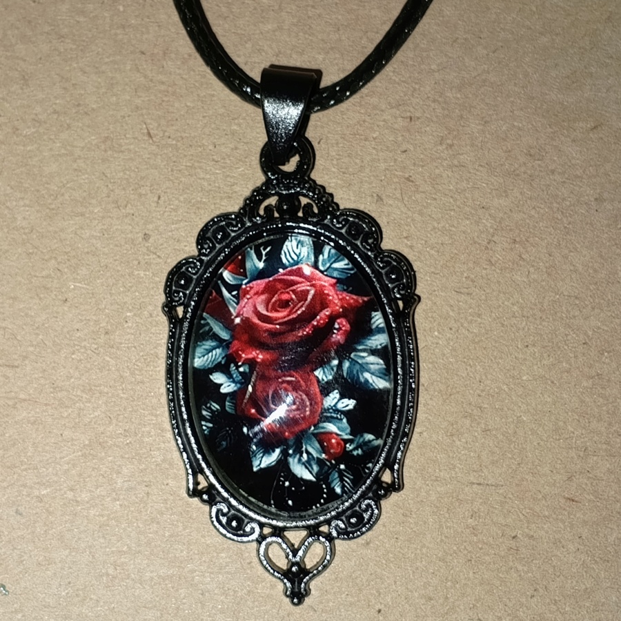 25592Украшение, завораживающее строгой красотой и сочетанием глубоких оттенков красного и зеленого на черном фоне. Рисунок с розами выглядит как живой благодаря выпуклому стеклу кулона.