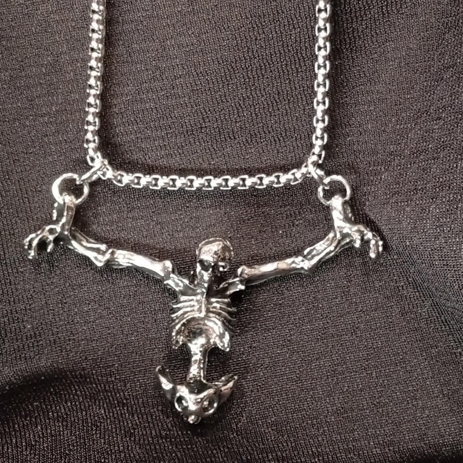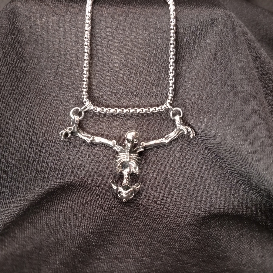 25617Эффектное украшение со скелетом без ног. У кулона две петельки для подвеса в виде наручников на руках скелета.