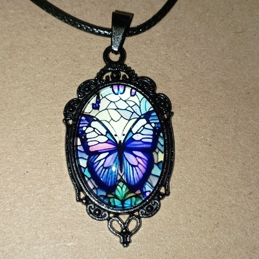 25590Кулон со стеклянной вставкой в черной оправе. Под стеклом рисунок разноцветной бабочки на фоне узора, похожего на ее же крылья.