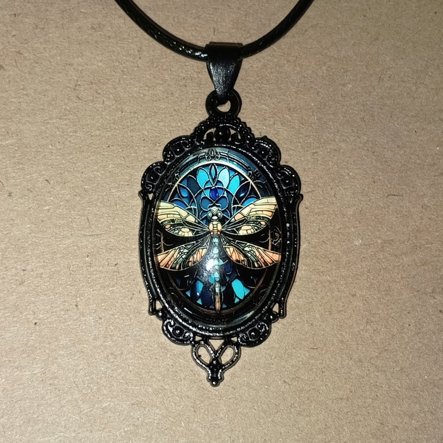 25589Стильный небольшой кулон с изображением стрекозы на фоне готических витражей. Оправа - металл с черным покрытием