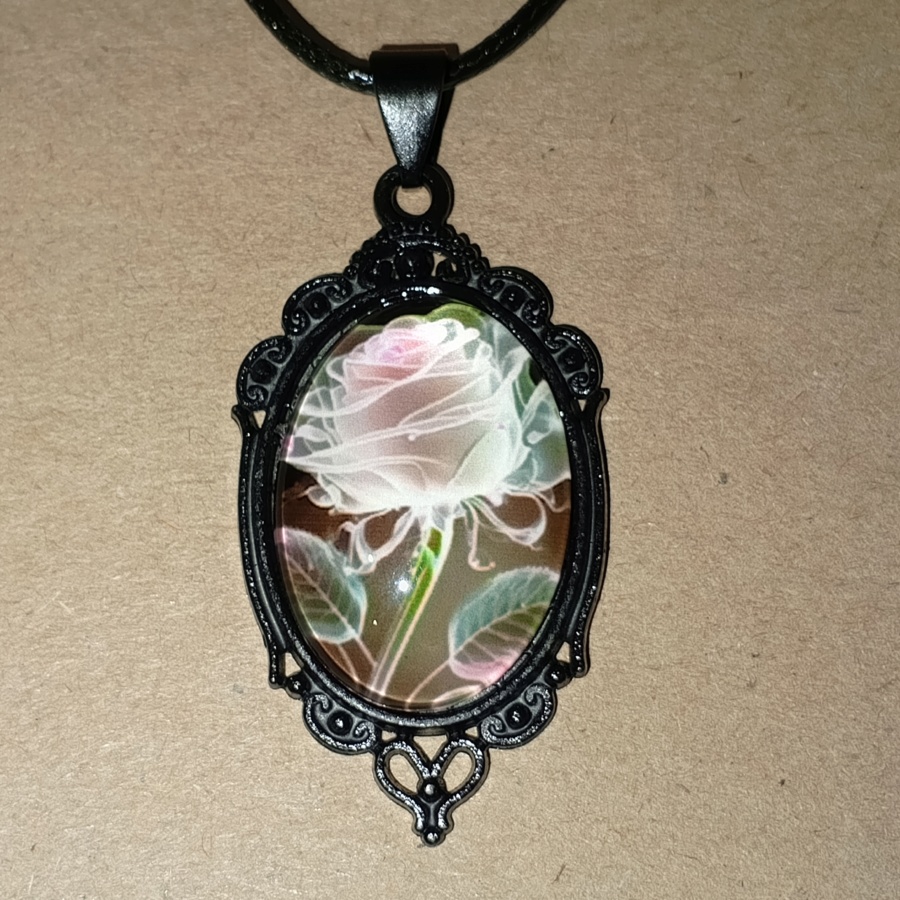 25593Кулон с выпуклой стеклянной вставкой в черной оправе. Под стеклом светло-розовая роза с интересными переходами цвета в зеленый. строгое и одновременно утонченное украшение.