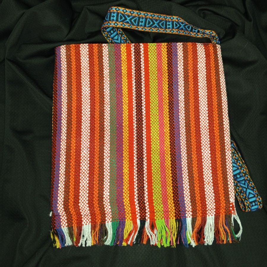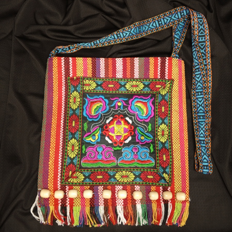 25602Сумка с одним отделением без карманов, застегивается на замок-молнию сверху. Яркое пестротканое полотно является основой для лицевой стороны сумки. Спереди нашита черная ткань с ярком машинной вышивкой в рамке их широкой тесьмы с цветами. Крупные бусины из дерева и бахрома снизу создают еще более нарядный и декоративный вид. У сумки нет клапана, накидывающегося сверху, она просто окрывается как мешок, внутри которого гладкий подклад.