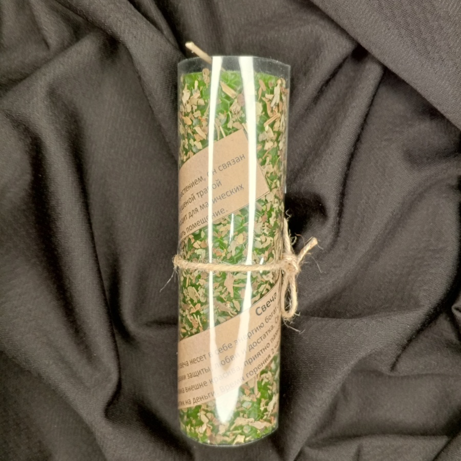 1972Зеленая свеча несет в себе энергию богатства и изобилия. Базилик издавна считается магическим растением, он связан со сферами защиты, любви и достатка. Свеча из натурального вощинного листа зеленого цвета с сушеной травой базилика внешне красива, приятно пахнет и наполняет пространство созидательной силой. Толщина свечи 4 см., длина 12 см.