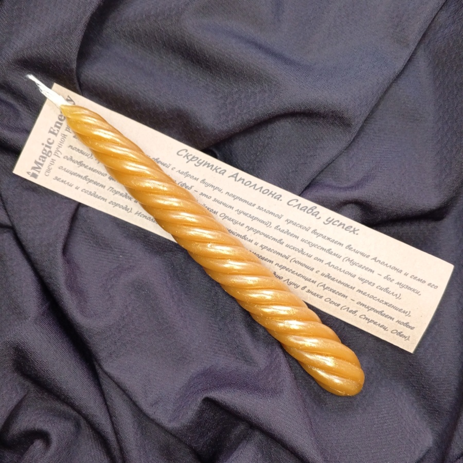 25582Скрутка из 7 желтых свечей с лавром внутри, покрытая золотой, краской выражает величие Аполлона и семь его главных качеств. Он несет Свет (Феб – это значит лучезарный), владеет искусствами (Мусагет – бог музыки, поэзии), предсказывает будущее (в Дельфийском Оракуле пророчества исходили от Аполлона через сивилл), одновременно целитель и каратель, обладает совершенством и красотой (юноша с идеальным телосложением), олицетворяет Порядок и Закон (покровитель императора), помогает переселенцам (Архегет – открывает новые земли и создает города). Использовать для привлечения успеха на молодую Луну в знаке Огня (Лев, Стрелец, Овен).